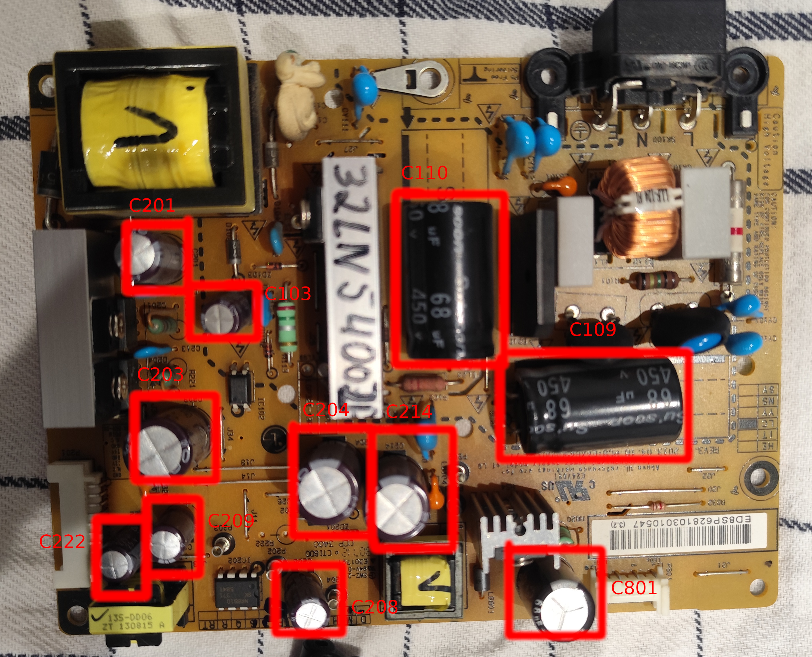 Do wymiany jest 11 kondensatorów o nastepujących oznaczeniach: